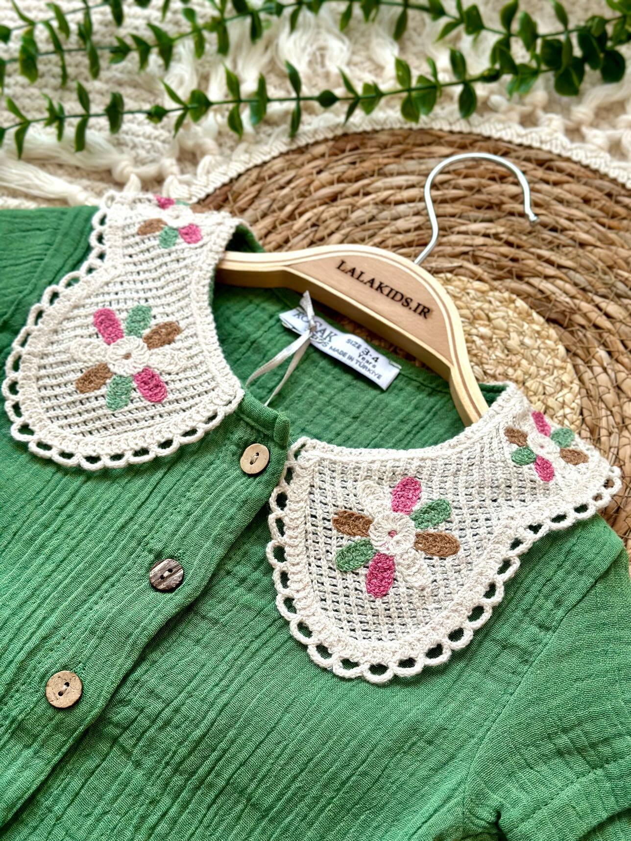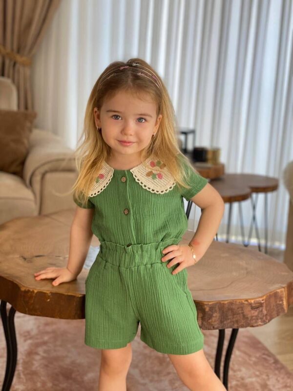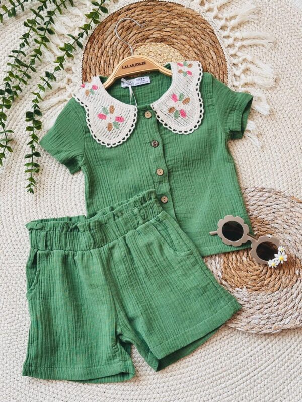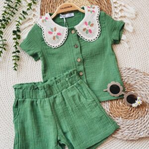 خانه دخترانه ست تیشرت شلوارک و تاپ شلوارک دخترانه شومیز قلاب بافی و شورتک کد 3983